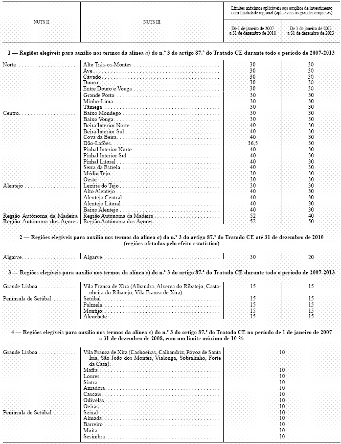 1 - Em conformidade com o mapa nacional dos auxílios estatais com finalidade regional para o período até 31 de dezembro de 2013, aprovado pela Comissão Europeia em 7 de julho de 2007, os limites máximos aplicáveis aos benefícios fiscais concedidos no âmbito do RFAI são os seguintes: